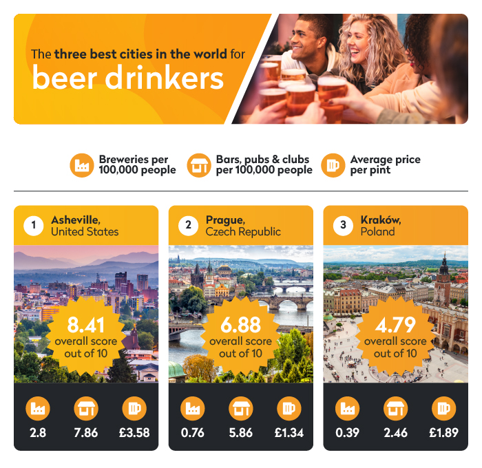 Asheville in the United States tops the list, with the highest concentration of bars, pubs and clubs in the rankings – a whopping 7.86 establishments existing per 10,000 people. Prague sits in second place, while also boasting the second-cheapest pint on the list,at £1.34.