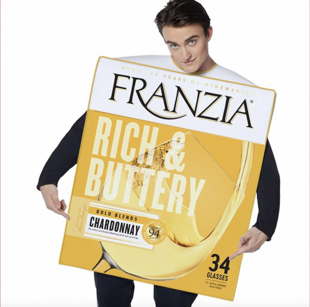 “Blurring the line between costume and reality, this year’s Franzia boxed wine outfit has a trick and a treat up its sleeve,” Franzia said. “The new design includes an internal side pouch that can carry a full bag of Franzia. When worn over the shoulder underneath the costume, the wearer can dispense wine to become a human box of Franzia!”