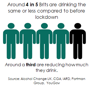 Despite the lockdowns leading to more people drinking at home, Portman Group analysis of 31 polls found 77% of UK adults drank the same or less than they did before the lockdown started in February 2020.