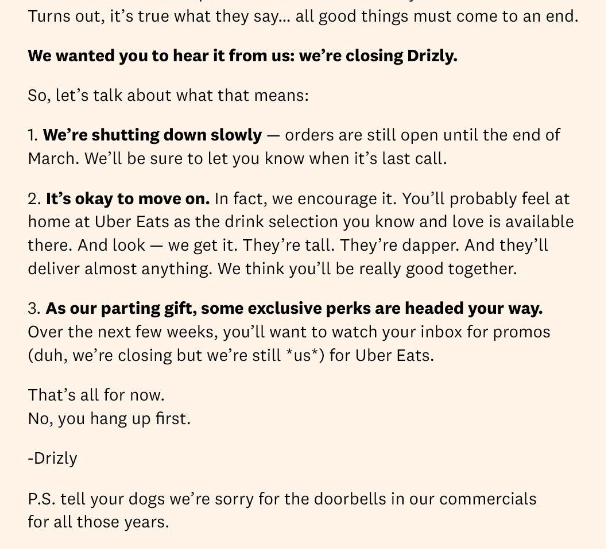 “Turns out, it’s true what they say… all good things must come to an end,” Drizly said in a statement.