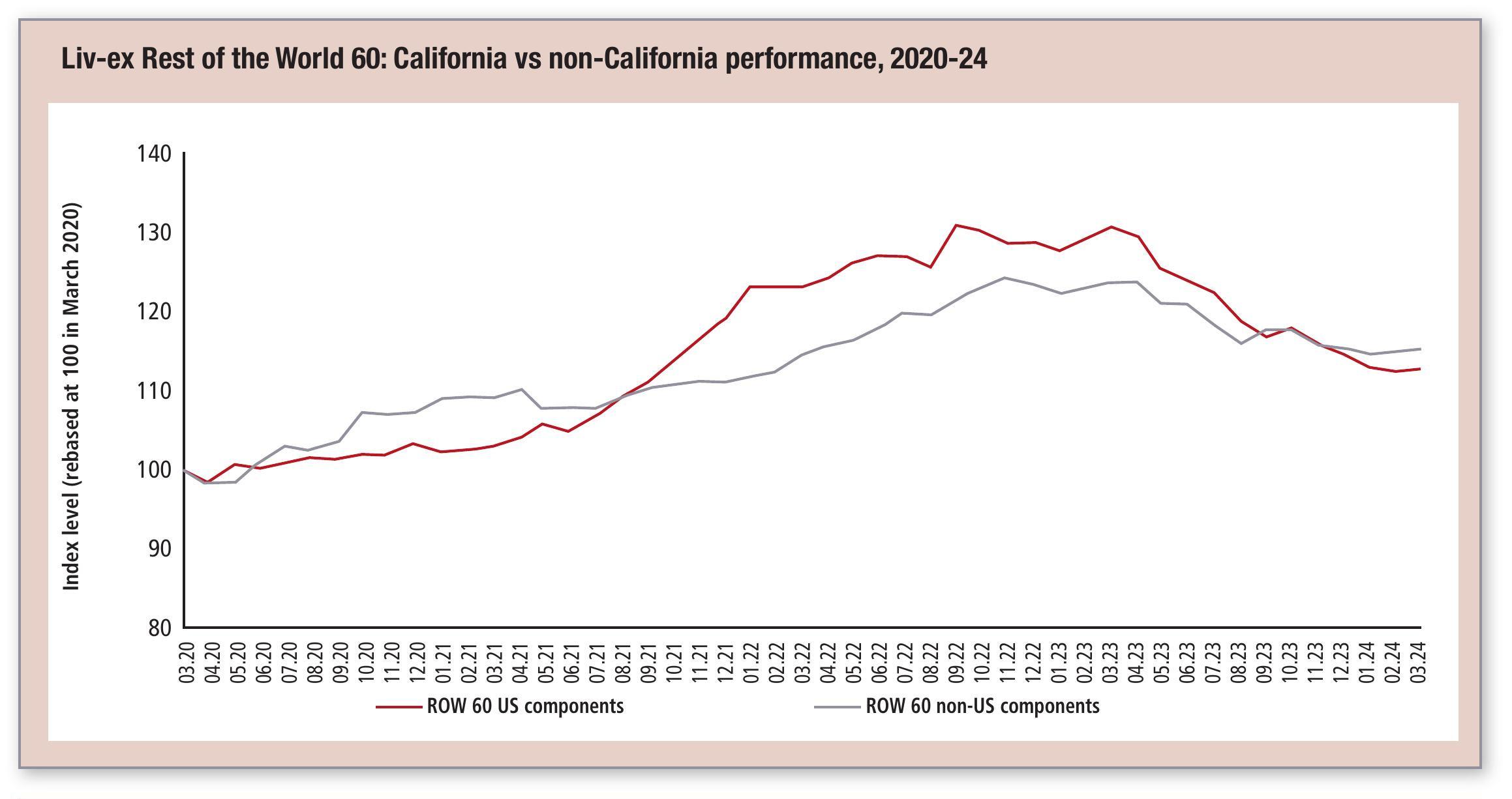 However, the Liv-ex graph (above) shows that, while the California components of the Rest of the World 60 may be currently bringing the index down, they also clearly outperformed their non-US components during the 2021/22 fine wine market boom. (NB: as Seña was only added to the index in January 2023, the non-US components in this graph do not include the wine.)