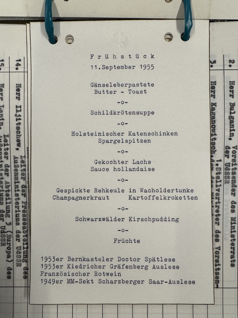 On 11 September 1955, ten years after the end of the Second World War, the 1953 Bernkasteler Doctor was served in Moscow at the lunch which concluded Chancellor Konrad Adenauer’s historic meeting with Soviet leaders Nikolai Bulganin, Nikita Khrushchev, and Vyacheslav Molotov. Adenauer, 80 years old at the time, had flown to Moscow to negotiate the agreement that would secure the release of the last 10,000 German prisoners of war from Soviet camps.