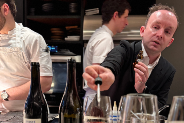 Douglas Blyde went to Aulis to discover one of Charles Carron Brown’s signature non-alcoholic serves – ‘Red Wine Not Red Wine’, a fixture on the menu since September 2023. Built from Black Sun tea (Postcard Teas), unfermented red grape juice, beetroot, blackberries, blackcurrants, cocoa nibs, spent vines from Everflyht, black peppercorns, red wine vinegar and a blackcurrant wood infusion, it is cooked hard, strained and fined. Finished at counter with a few drops of the wood infusion, it’s served at room temperature alongside fallow deer deepened with fermented black garlic. One hopes Brown will one day release his drinks beyond the dining room.