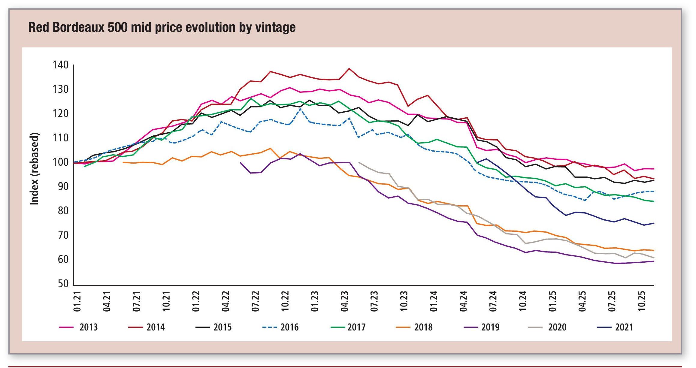 Wines that have found stability over the past six months include the likes of Palmer, Léoville Las Cases and Grand-Puy-Lacoste. While price stability is not yet quite so certain with this set, they are perhaps showing enough to make them worth consideration, particularly if they receive favourable ‘10 years on’ ratings. Cheval Blanc 2016’s trade over 2025 is indicative of recovery. From a low of £4,580/US$5,762 per 12x75cl (equivalent to €462.20 per bottle), trade prices rose consistently across the year, albeit with a recent outlier at £6,508/€7,991 or €624.40 per bottle. While both of these trades were in three-packs, six-pack trade prices showed stability in the second half of 2025, narrowing to Market Price.